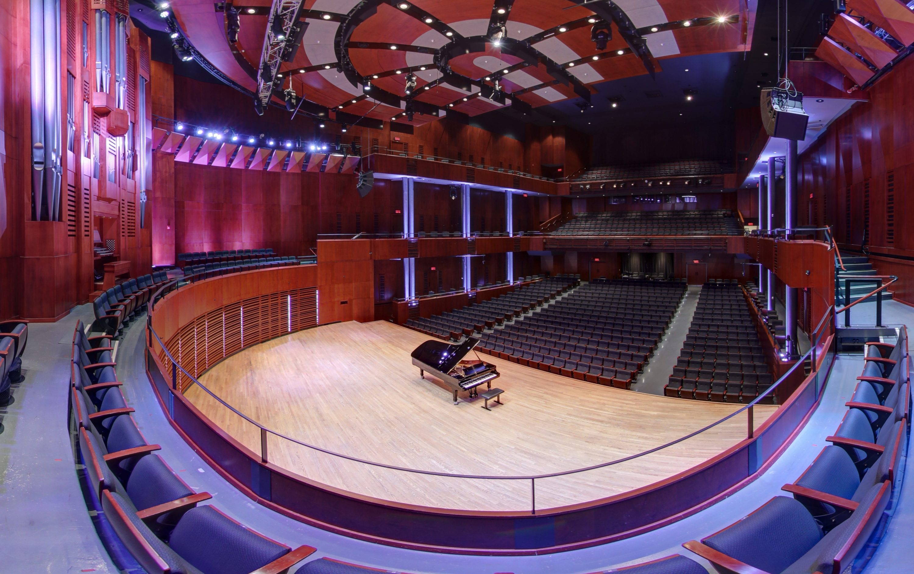 Une canopée – un plafond mobile – peut être élevée ou abaissée selon les spectacles présentés sur scène. Des rideaux dissimulés dans des niches, au parterre, à la corbeille et au balcon, peuvent recouvrir la presque totalité des parois de bois de la salle pour ajuster l’acoustique selon le type de concert.